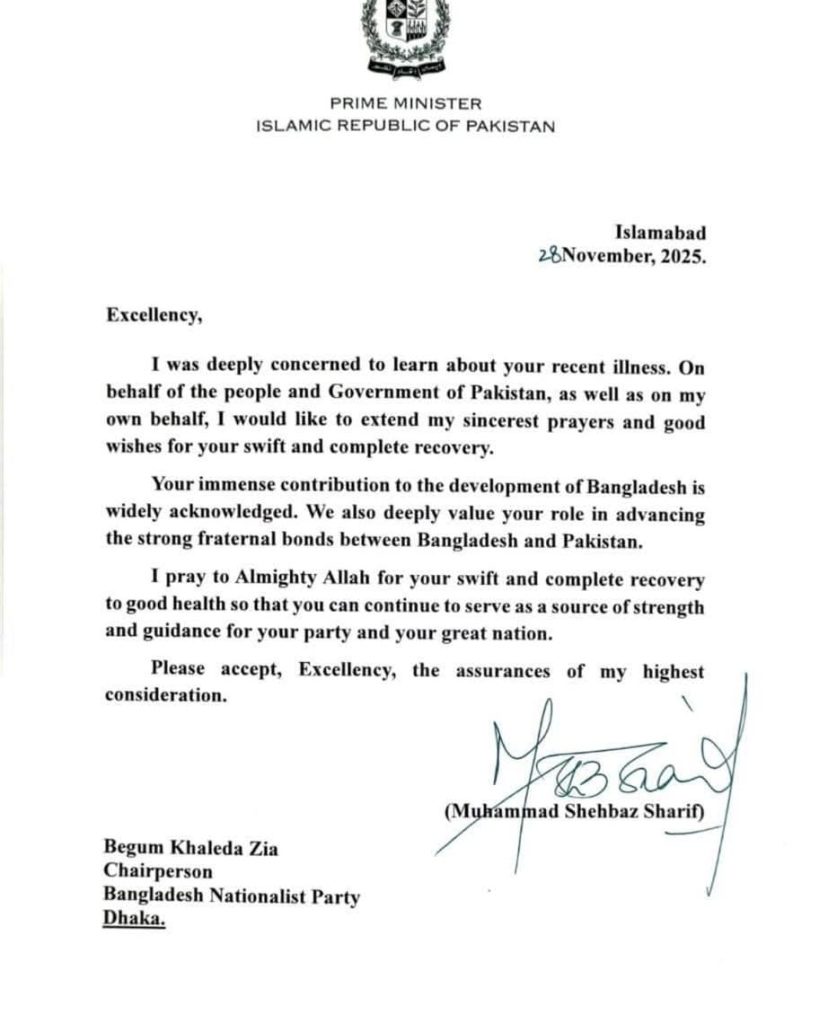 বিএনপির চেয়ারপারসন ও তিনবারের সাবেক প্রধানমন্ত্রী খালেদা জিয়ার গুরুতর অসুস্থতার প্রেক্ষাপটে পাকিস্তানের প্রধানমন্ত্রী মুহাম্মদ শাহবাজ শরিফ তাঁর প্রতি গভীর সহমর্মিতা ও আরোগ্য কামনা জানিয়ে একটি চিঠি পাঠিয়েছেন। গত ২৮ নভেম্বর লেখা চিঠিটি শনিবার রাতে বিএনপির ভেরিফায়েড ফেসবুক পেজে প্রকাশ হওয়ার পর দেশের রাজনৈতিক অঙ্গন ও আন্তর্জাতিক মহলে নতুন আলোচনা সৃষ্টি হয়েছে।
